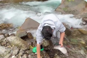 男子五一前去西岭雪山玩,在河里抓到了鳟鱼,笑得合不拢嘴