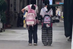 女生出门买东西时偶遇两个小朋友,俩人慢慢悠悠往前挪